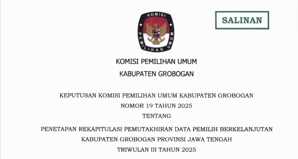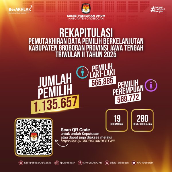 Menindaklanjuti Surat Dinas Sekretaris Jenderal KPU Republik Indonesia Nomor 2544/ORT.07-SD/01/2025 Tanggal 28 Juli 2025 Perihal Pelaksanaan Survei Kepuasan Masyarakat (SKM), untuk peningkatan kualitas layanan KPU Kabupaten Grobogan pada triwulan II / Semester I Tahun 2025. Mohon #TemanPemilih dapat meluangkan waktu untuk mengisi kuesioner survei kepuasan layanan dengan scan barcode diatas atau klik tautan berikut ini :