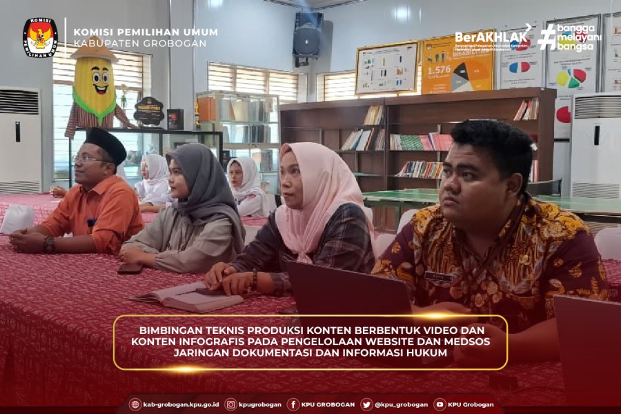 Hai #TemanPemilih, bertempat di aula, KPU Kabupaten Grobogan mengikuti Bimbingan Teknis (Bimtek) Produksi Konten Video dan Infografis pada Pengelolaan Website dan Media Sosial Jaringan Dokumentasi dan Informasi Hukum (JDIH), Senin (15/9/2025). Kegiatan yang diselenggarakan oleh KPU Provinsi Jawa Tengah ini digelar secara daring dan diikuti oleh KPU Kabupaten/Kota se-Jawa Tengah.