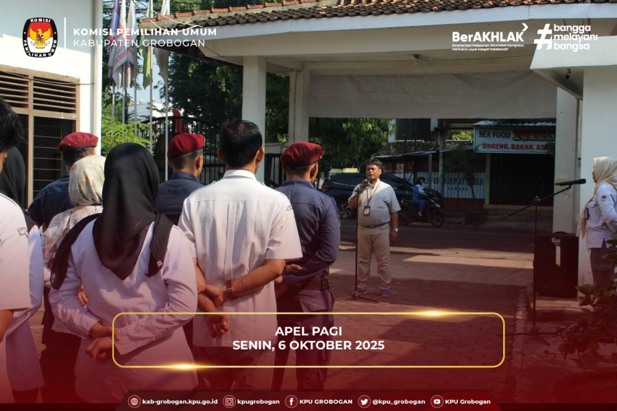 Hai #TemanPemilih, KPU Kabupaten Grobogan menggelar giat apel pagi bertempat di halaman kantor KPU Kabupaten Grobogan, Senin (6/10/2025). Kegiatan yang merupakan agenda rutin mingguan ini diikuti oleh Ketua KPU Kabupaten Grobogan beserta jajaran Sekretariat KPU Kabupaten Grobogan.