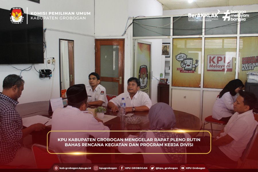 Hai #TemanPemilih, KPU Kabupaten Grobogan menggelar Rapat Pleno Rutin bertempat di lantai 2 Kantor KPU Kabupaten Grobogan, Senin (3/11/2025). Rapat dipimpin langsung oleh Ketua KPU Kabupaten Grobogan, Agung Sutopo, S.Pi., dan diikuti oleh Anggota KPU Kabupaten Grobohan serta para Kasubbag Sekretariat KPU Kabupaten Grobogan.