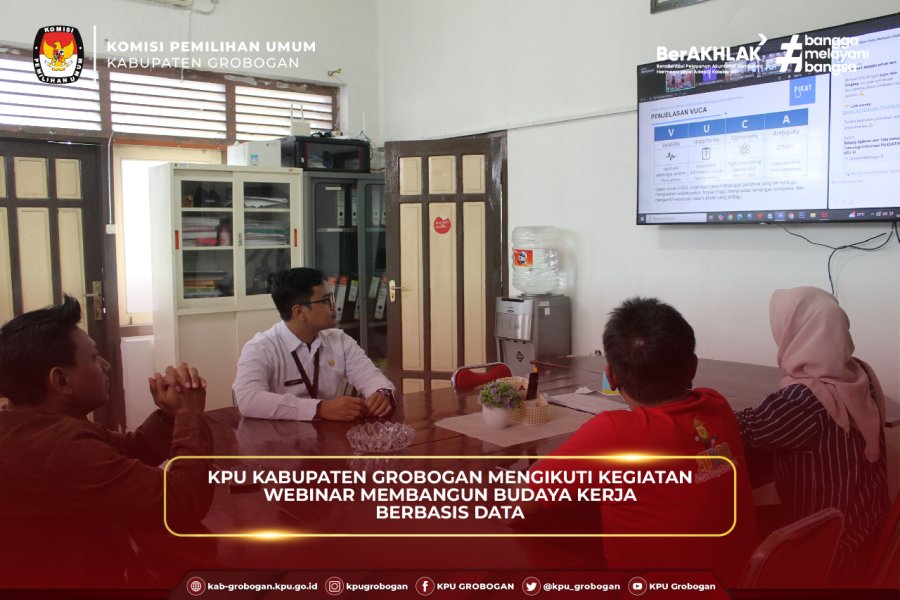 Hai #TemanPemilih, KPU Kabupaten Grobogan mengikuti kegiatan Webinar Membangun Budaya Kerja Berbasis Data bertempat di lantai 2 Kantor KPU Kabupaten Grobogan, Jumat (14/11/2025). Kegiatan yang diselenggarakan secara daring oleh KPU Republik Indonesia ini diikuti oleh KPU Provinsi, KIP Aceh, serta KPU/KIP Kabupaten/Kota dari seluruh Indonesia.