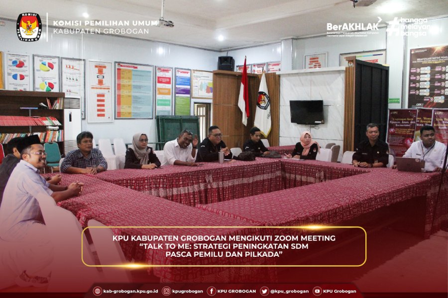 Hai #TemanPemilih, KPU Kabupaten Grobogan mengikuti Zoom Meeting “Talk To Me: Strategi Peningkatan SDM Pasca Pemilu dan Pilkada” yang diselenggarakan oleh KPU Provinsi Jawa Tengah, Rabu (26/11/2025). Kegiatan yang telah memasuki seri keempat ini diikuti oleh KPU Kabupaten/Kota se-Jawa Tengah serta perwakilan dari beberapa KPU Provinsi.
