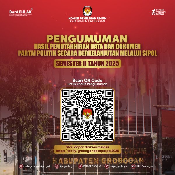 Hai #TemanPemilih, berikut kami sampaikan Pengumuman Hasil Pemutakhiran Data dan Dokumen Partai Politik Secara Berkelanjutan Melalui Sipol Semester II Tahun 2025.
