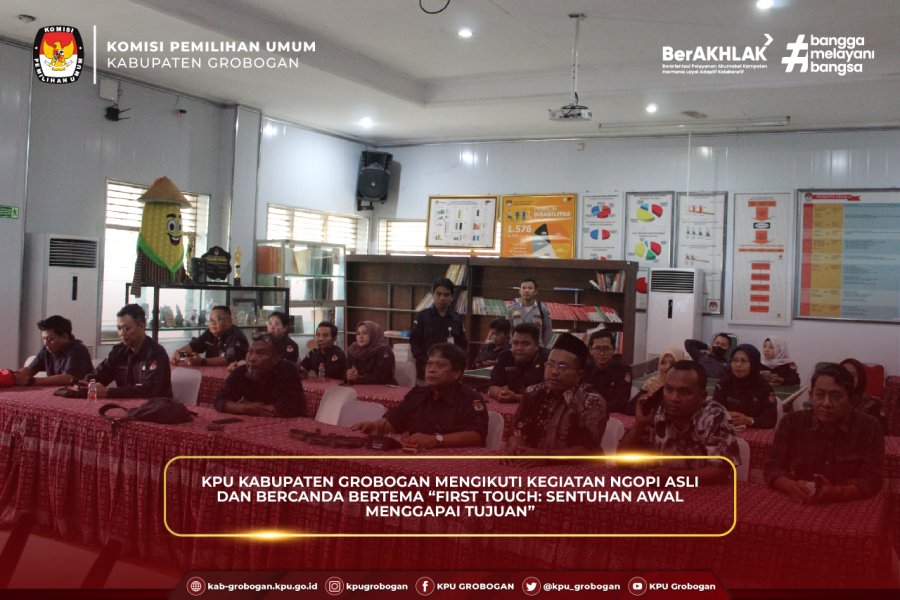 Hai #TemanPemilih, KPU Kabupaten Grobogan mengikuti kegiatan Ngopi Asli dan Bercanda bertema “First Touch: Sentuhan Awal Menggapai Tujuan” yang diselenggarakan oleh KPU Provinsi Jawa Tengah secara daring, Selasa (13/1/2026), bertempat di aula KPU Grobogan. Kegiatan ini diikuti oleh seluruh KPU Kabupaten/Kota se-Jawa Tengah.