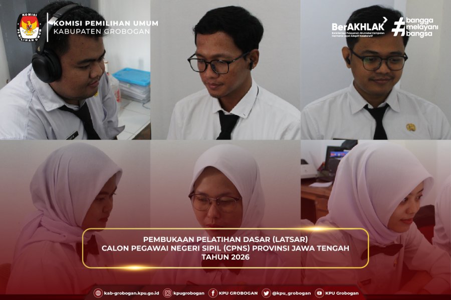 Hai #TemanPemilih, sejumlah enam CPNS Sekretariat KPU Kabupaten Grobogan mengikuti kegiatan Pembukaan Pelatihan Dasar (Latsar) Calon Pegawai Negeri Sipil (CPNS) Provinsi Jawa Tengah Tahun 2026 yang dilaksanakan secara daring, Rabu (14/01/2026). Kegiatan ini diselenggarakan oleh Badan Pengembangan Sumber Daya Manusia Daerah (BPSDMD) Provinsi Jawa Tengah.