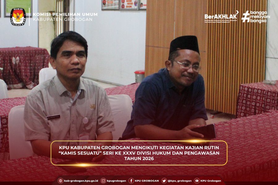 Hai #TemanPemilih, KPU Kabupaten Grobogan mengikuti kegiatan Kajian Rutin “Kamis Sesuatu” Seri ke XXXV Divisi Hukum dan Pengawasan Tahun 2026, Kamis (15/1/2026), bertempat di Aula Kantor KPU Kabupaten Grobogan. Kegiatan diselenggarakan oleh KPU Provinsi Jawa Tengah secara daring dan diikuti oleh KPU Kabupaten/Kota se-Jawa Tengah.