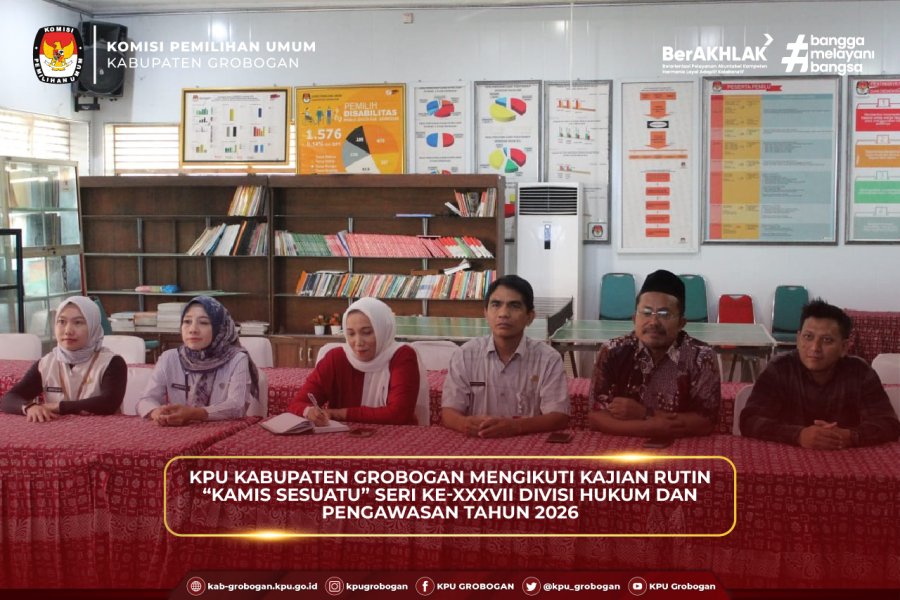 Hai #TemanPemilih, bertempat di aula, KPU Kabupaten Grobogan mengikuti Kajian Rutin “Kamis Sesuatu” Seri ke-XXXVII Divisi Hukum dan Pengawasan Tahun 2026 yang diselenggarakan oleh KPU Provinsi Jawa Tengah secara daring dan diikuti oleh KPU Kabupaten/Kota se-Jawa Tengah, Kamis (29/1/2026). Kajian kali ini mengangkat tema “Putusan Mahkamah Konstitusi di Pilkada Tahun 2024 Antara Teknis, Hukum, Politik dan Masalah-Masalah Lainnya” dengan menghadirkan narasumber Hepriyadi, S.H., M.H. (Advokat), serta Yusuf Agung Purnama, S.H., M.H., CPLA. (Advokat), dan dimoderatori oleh Rizki Veriyanti, S.E., M.M. dari KPU Provinsi Jawa Tengah.