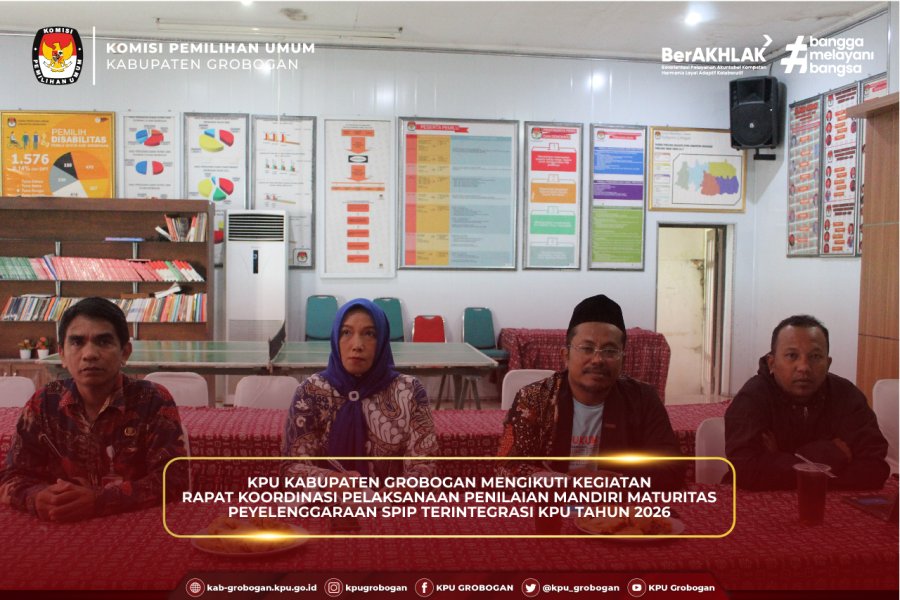 Hai #TemanPemilih, bertempat di aula, KPU Kabupaten Grobogan mengikuti kegiatan Rapat Koordinasi Pelaksanaan Penilaian Mandiri Maturitas Peyelenggaraan SPIP Terintegrasi KPU Tahun 2026, Jum’at (30/1/2026). Kegiatan yang diselenggarakan oleh KPU RI secara hybrid ini diikuti oleh KPU Provinsi, KIP Aceh dan KPU/KIP Kabupaten/Kota se-Indonesia.