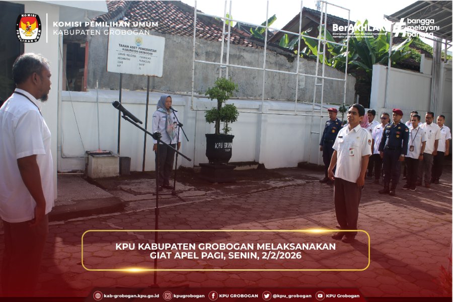 Hai #TemanPemilih, KPU Kabupaten Grobogan melaksanakan Apel Pagi, Senin (2/2/2026) bertempat di halaman Kantor KPU Kabupaten Grobogan. Apel pagi ini diikuti oleh Anggota KPU Kabupaten Grobogan serta jajaran Sekretariat KPU Kabupaten Grobogan.
