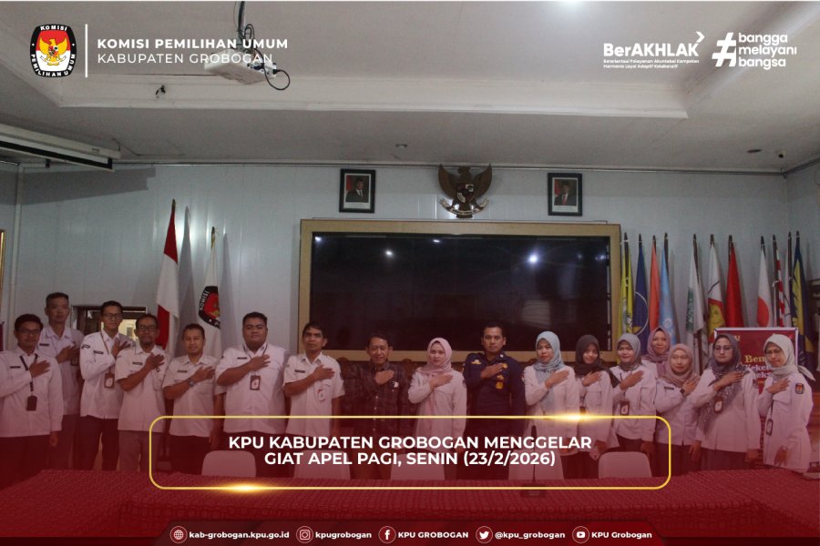 Hai #TemanPemilih, KPU Kabupaten Grobogan menggelar Apel Pagi, Senin (23/2/2026) yang diikuti oleh Anggota serta jajaran Sekretariat KPU Kabupaten Grobogan. Kegiatan yang semula direncanakan di halaman kantor tersebut dipindahkan ke aula kantor karena kondisi cuaca yang tidak mendukung.