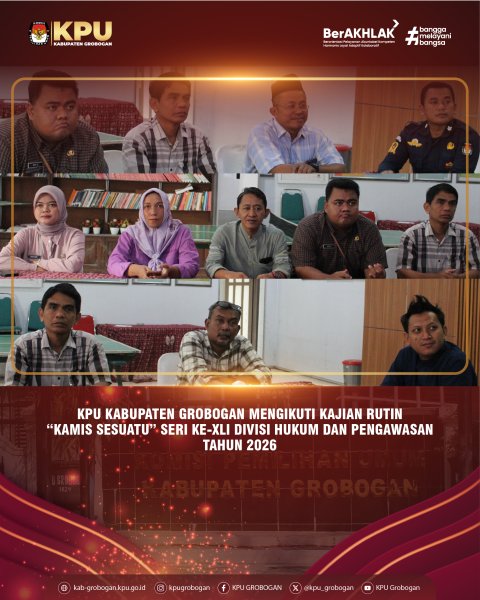 Hai #TemanPemilih, bertempat di aula, KPU Kabupaten Grobogan mengikuti Kajian Rutin “Kamis Sesuatu” Seri ke-XLI Divisi Hukum dan Pengawasan Tahun 2026, Kamis (26/2/2026). Kegiatan ini merupakan agenda yang diselenggarakan oleh KPU Provinsi Jawa Tengah dan diikuti oleh KPU Kabupaten/Kota se-Jawa Tengah.
