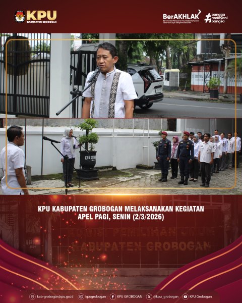 Hai #TemanPemilih, KPU Kabupaten Grobogan melaksanakan kegiatan Apel Pagi, Senin (2/3/2026) yang bertempat di halaman Kantor KPU Kabupaten Grobogan. Kegiatan rutin tersebut diikuti oleh Anggota KPU Kabupaten Grobogan serta jajaran Sekretariat KPU Kabupaten Grobogan.
