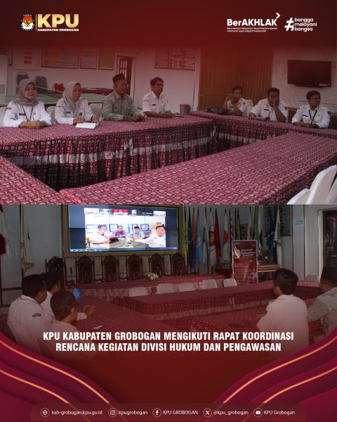 Hai #TemanPemilih, bertempat di aula KPU Kabupaten Grobogan mengikuti Rapat Koordinasi Rencana Kegiatan Divisi Hukum dan Pengawasan, Senin (2/3/2026). Kegiatan ini diselenggarakan oleh KPU Provinsi Jawa Tengah secara daring dan diikuti oleh KPU Kabupaten/Kota se-Jawa Tengah.