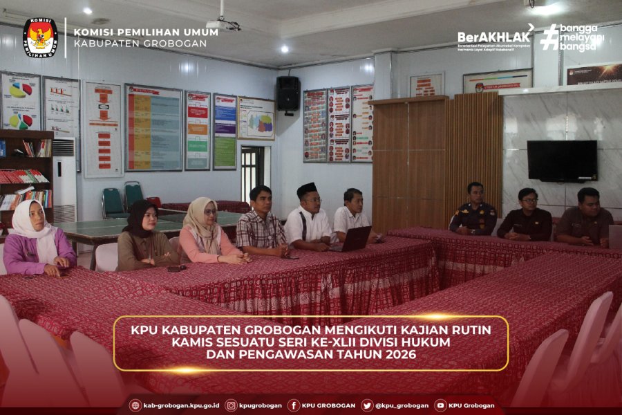 Hai #TemanPemilih, bertempat di aula, KPU Kabupaten Grobogan mengikuti Kajian Rutin Kamis Sesuatu Seri ke-XLII Divisi Hukum dan Pengawasan Tahun 2026, Kamis (5/3/2026). Kegiatan yang diselenggarakan secara daring oleh KPU Provinsi Jawa Tengah ini diikuti oleh KPU Kabupaten/Kota se-Jawa Tengah.