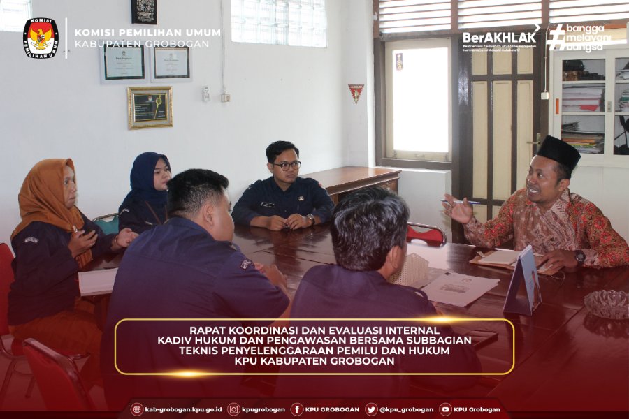 Hai #TemanPemilih, bertempat di lantai 2, KPU Kabupaten Grobogan menggelar Rapat Koordinasi dan Evaluasi Internal Kadiv Hukum dan Pengawasan bersama Subbagian Teknis Penyelenggaraan Pemilu dan Hukum KPU Kabupaten Grobogan, Selasa (31/3/2026).
