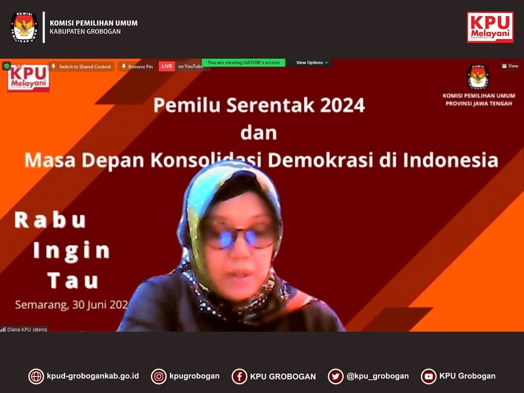 Hari ini KPU Kabupaten Grobogan mengikuti kegiatan Rabu Ingin Tahu (RIT) dengan tema Pemilu Serentak Tahun 2024 dan Masa Depan Konsolidasi Demokrasi di Indonesia secara daring yang diselenggarakan oleh KPU Provinsi Jawa Tengah. Kegiatan ini dapat disaksikan secara live streaming pada Youtube KPU Provinsi Jawa Tengah dan diikuti oleh KPU Provinsi Jawa Tengah, KPU Kabupaten/ Kota se Jawa Tengah, serta masyarakat umum.