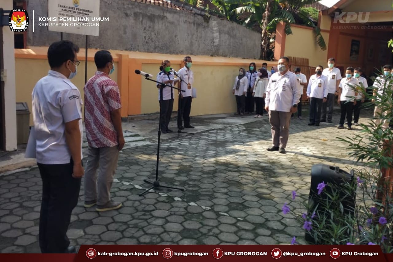 Pagi ini, bertempat di halaman KPU Kabupaten Grobogan dilaksanakan apel pagi. tepat pukul 08.15 WIB acara tersebut dilaksanakan. MEngambil tempat sebagai pembina apel adalah Anggota KPU Kabupaten Grobogan Divisi Perencanaan, Data Dan Indormasi Bapak Muhammad Machruz, ST. Sedangkan yang bertugas sebagai komandan apel adalah Kasubag Hukum, Pengawasan Dan SDM Eka Rama Saputra, SH.
