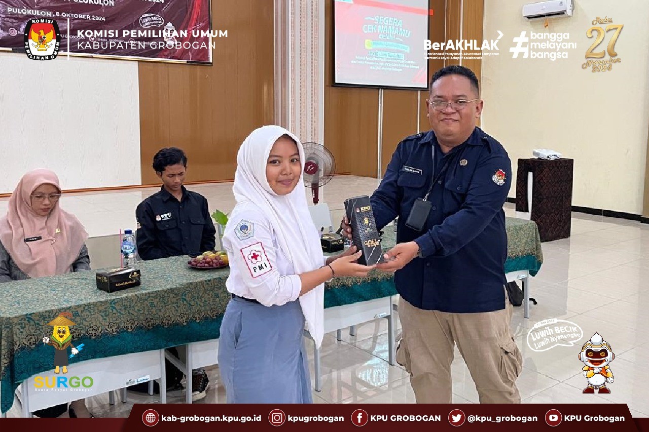 Sebelum acara ditutup, KPU Kabupaten Grobogan beserta dengan Relawan Demokrasi membagikan souvenir Pilkada Tahun 2024 kepada para peserta yang dapat menjawab kuis yang diberikan.