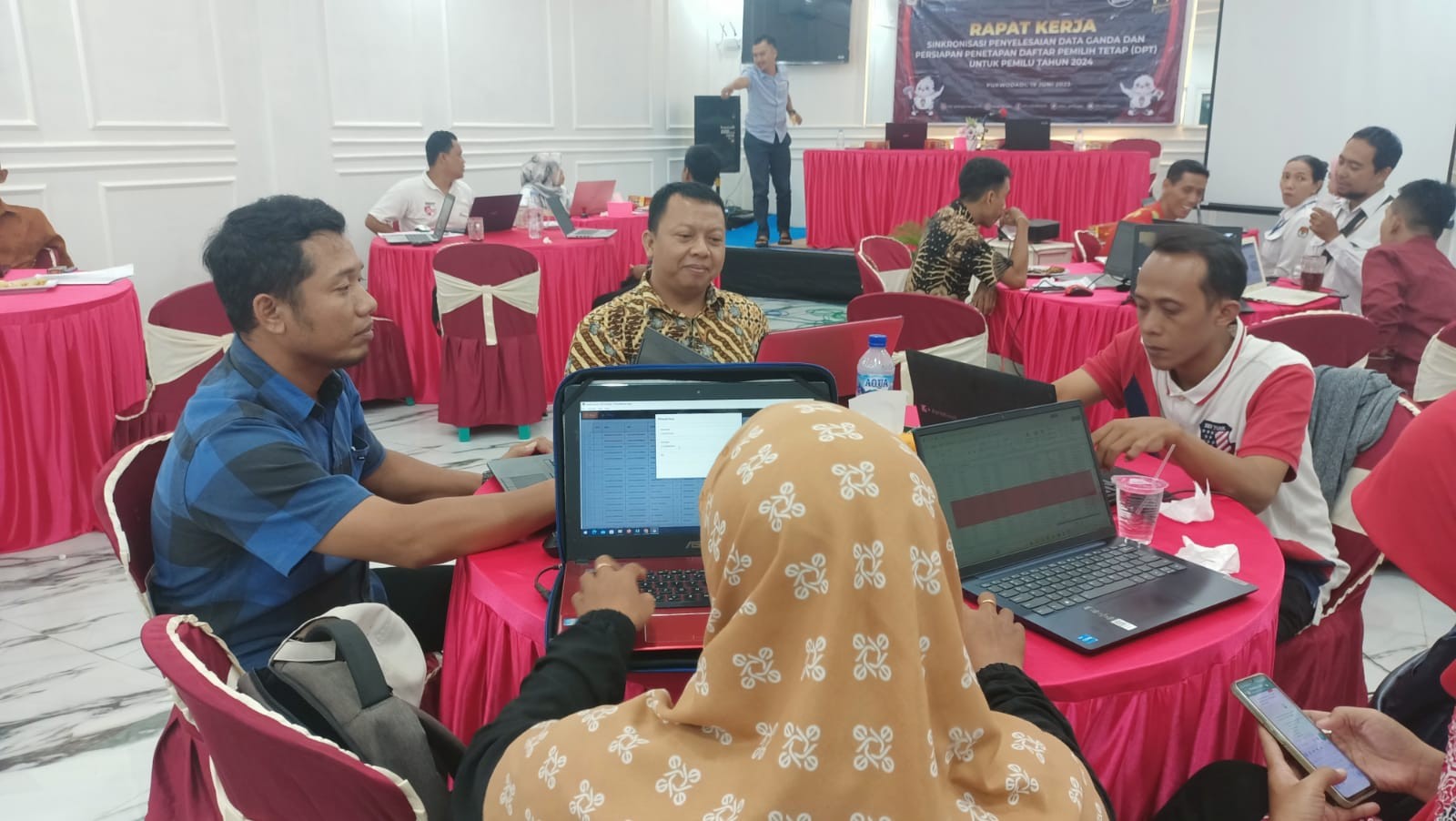 PURWODADI - Senin, 19 Juni 2023, tepat pukul 13.00 WIB bertempat di Kampoeng Sawah Krangganharjo (KSK) KPU Kabupaten Grobogan menggelar Rapat Kerja Sinkronisasi Penyelesaian Data Ganda Dan Persiapan Penetapan DPT Untuk Pemilu Tahun 2024. Raker ini mengundang seluruh Anggota PPK Koordinator Pemutakhiran Data se Kabupaten Grobogan.