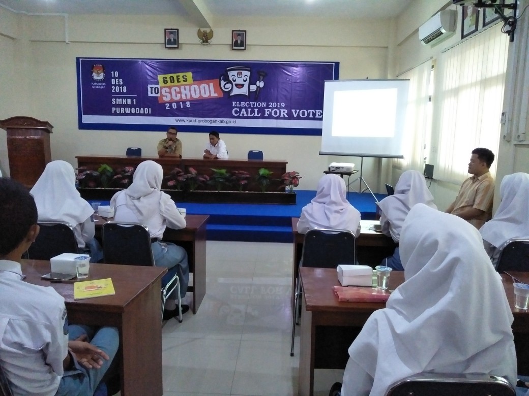 Kali ini SMK Negeri 1 Purwodadi menjadi target sosialisasi dari KPU Kab. Grobogan pada Senin 10 Desember 2018. Bapak Ngatiman, SE selaku Anggota KPU Kab. Divisi Sosialisasi, Pendidikan Pemilih Partisipasi Masyarakat dan Sumber Daya Manusia memberikan penjelasan mengenai berbagai hal kepada para siswa/siswi SMK Negeri 1 Purwodadi, seperti himbauan untuk menggunakan hak suara, segera melakukan proses rekam e KTP, menolak berbagai macam praktek politik uang, dan warna surat suara yang nantinya akan digunakan.