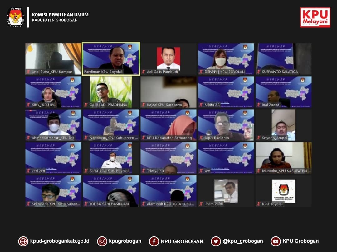 Tiga narasumber yang dihadirkan adalah Pardiman, S. Sos. M. Pd ( Anggota KPU Kabupaten Boyolali), Siti Solichah, S. Pd. I ( Anggota KPU Kabupaten Semarang) dan Ngatiman, SE (Anggota KPU Kabupaten Grobogan). Webinar kali ini diawali dengan sambutan dari Pramono Ubaid Tanthowi (Anggota KPU Republik Indonesia), Ali Fahrudin, SH ( Ketua KPU Kabupaten Boyolali) dan Yulianto Sudrajat, S. Sos, M. I. Kom (Ketua KPU Provinsi Jawa Tengah).