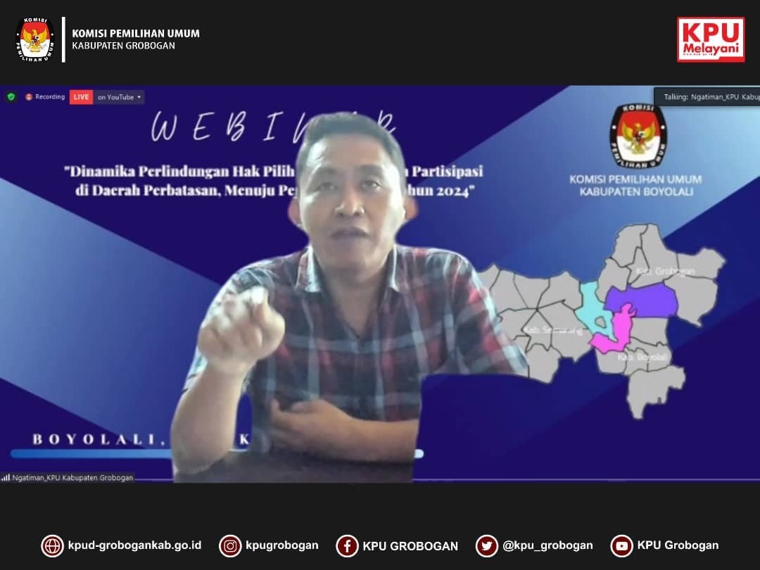 Hari ini, 14 Oktober 2021, KPU Kabupaten Grobogan berkesempatan menjadi salah satu narasumber dalam webinar yang diselenggarakan oleh KPU Kabupaten Boyolali. Webinar kali ini mengangkat tema "Dinamika Perlindungan Hak Pilih Dan Peningkatan Partisipasi Di Daerah Perbatasan, Menuju Pemilu Serentak Tahun 2024.