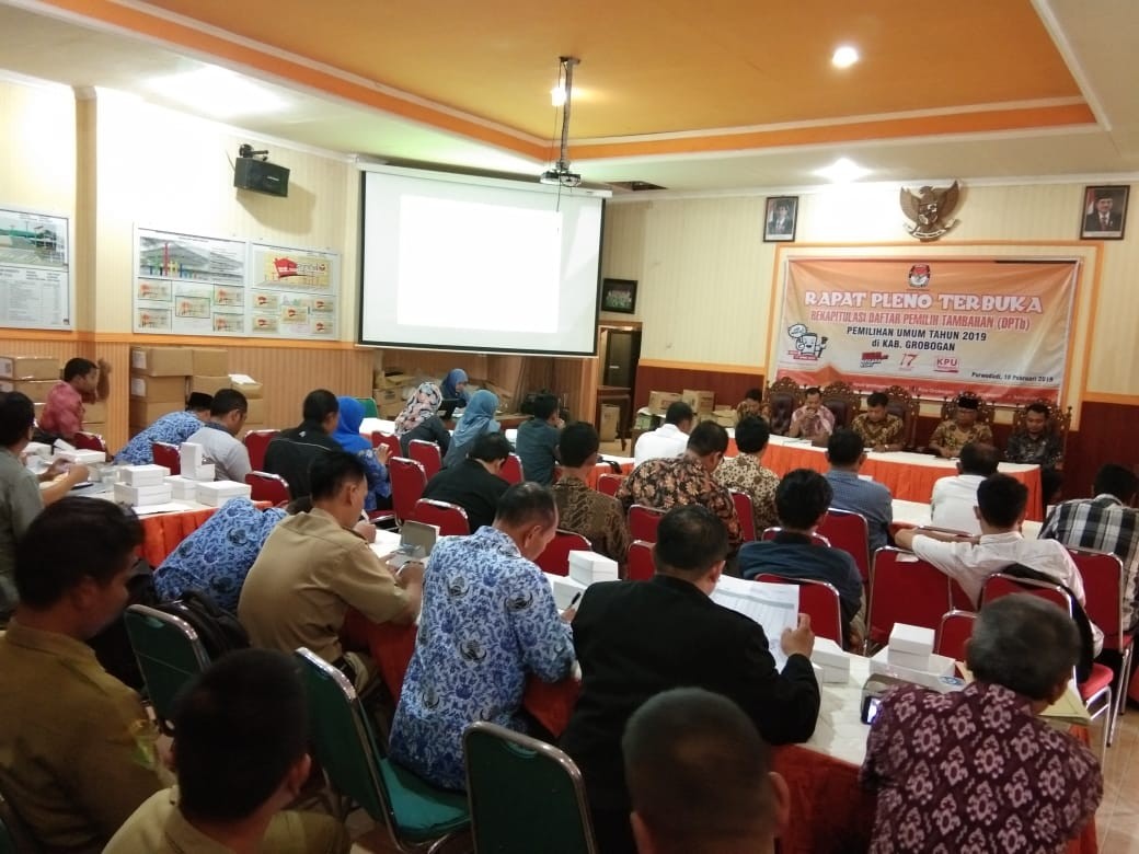 Hari ini, bertempat di Aula KPU Kab. Grobogan Jl. S. Parman No.2 Purwodadi, KPU Kab. Grobogan gelar Rapat Pleno Terbuka Penetapan Daftar pemilih Tambahan (DPTb) Tingkat Kabupaten/Kota dalam Pemilihan Umum Tahun 2019. Pada rapat pleno kali ini Muhammad Machruz, ST selaku Anggota KPU Kab. Grobogan divisi perencanaan, data dan informasi menyampaikan beberapa point penting sekitar penyusunan DPTb, seperti alasan pembuatan A5 sebagai dasar penyusunan DPTb, dasar hukum penyusunan DPTb, serta proses input DPTb yang melibatkan seluruh PPK dan PPS se kabupaten Grobogan.