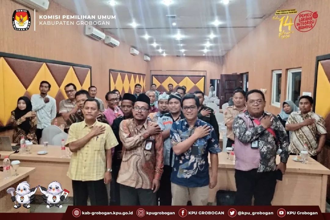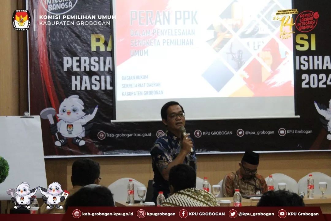 PURWODADI - Dalam rangka persiapan penyelesaian perselisihan hasil Pemilihan Umum Tahun 2024, Jum'at (1/12/2023), KPU Kabupaten Grobogan mengadakan Rapat Koordinasi Persiapan Menghadapi Perselisihan Hasil Pemilihan Umum Tahun 2024 dengan narasumber berasal dari Kepala Bagian Hukum Setda Grobogan, Bapak Riadqa Priambodo dan Anggota KPU Kabupaten Grobogan Divisi Hukum dan Pengawasan Bapak Muh. Syaifudin. Kegiatan yang bertempat di Hotel 21 Purwodadi ini diikuti oleh Anggota Panitia Pemilihan Kecamatan (PPK) Koordinator Hukum dan Pengawasan beserta Sekretaris Panitia Pemilihan Kecamatan (PPK) se-Kabupaten Grobogan.