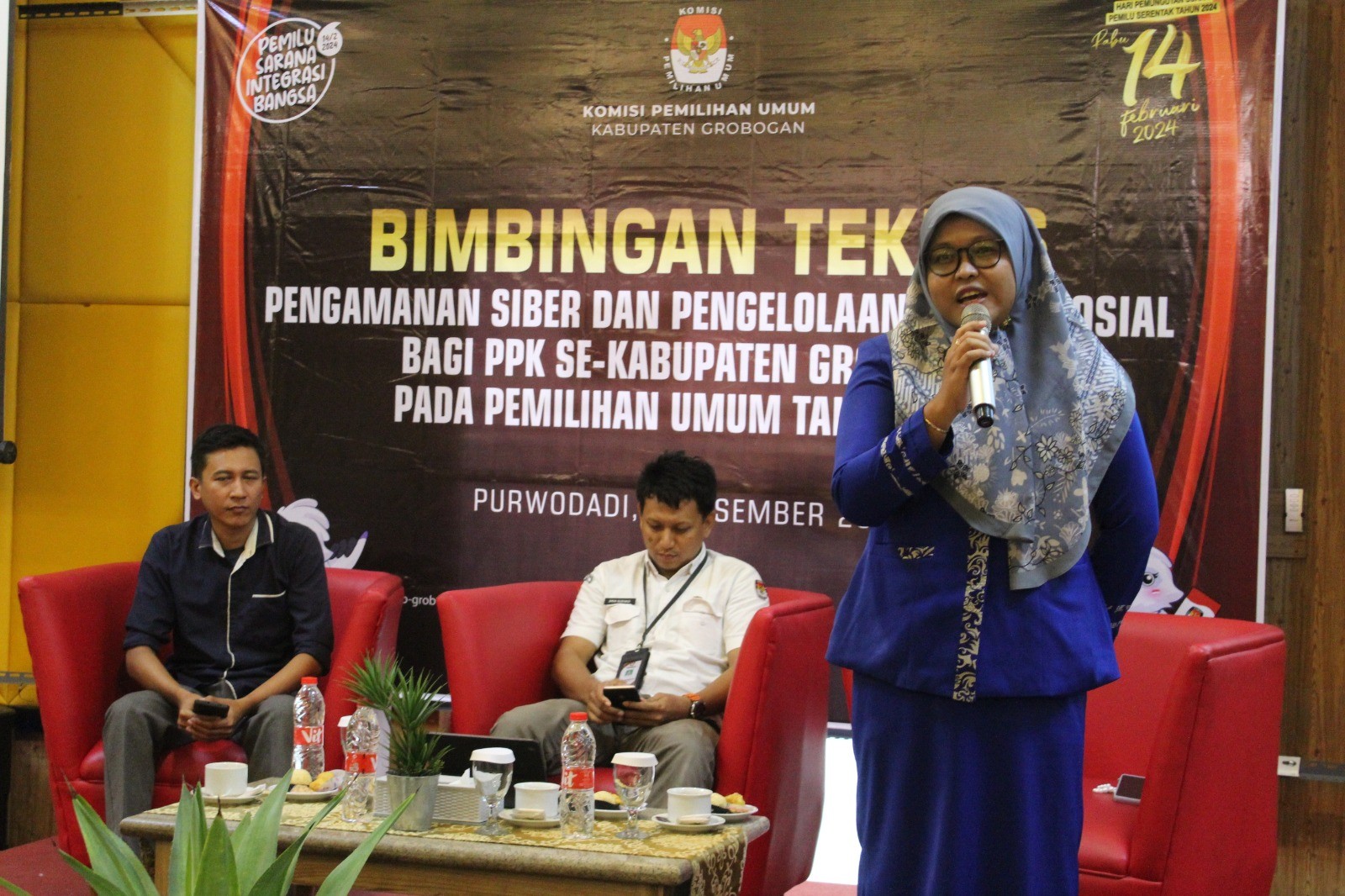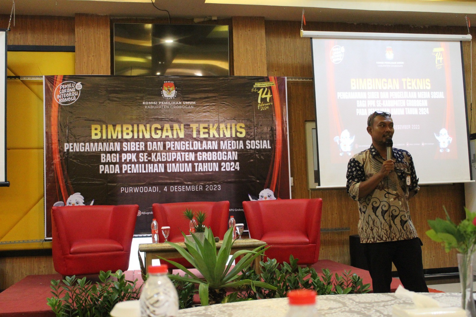PURWODADI - Senin (4/12/2023), KPU Kabupaten Grobogan mengadakan Bimbingan Teknis Pengamanan Siber dan Pengelolaan Media Sosial Bagi PPK se-Kabupaten Grobogan pada Pemilihan Umum Tahun 2024 dengan narasumber Bapak Dwi Setiawan, M.Kom dari Universitas Sains dan Teknologi Komputer Semarang, dan Ibu Sindhu Rakasiwi, M.Kom dari Universitas Dian Nuswantoro Semarang.