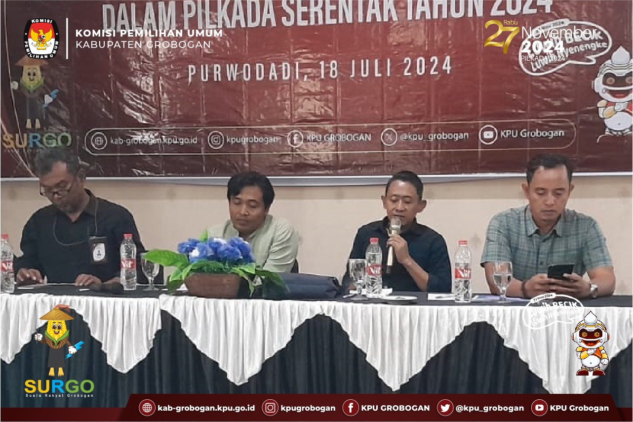 Hai #temanpemilih , Kamis (18/7/2024) KPU Kabupaten Grobogan gelar Workshop Kehumasan dengan Media Cetak dan Elektronik dalam Pilkada Serentak Tahun 2024. Acara yang bertempat di Ruang Kemala Hotel Grand Master Purwodadi ini diikuti oleh OPD terkait, Bawaslu Kabupaten Grobogan, Anggota Persatuan Wartawan Indonesia (PWI) , Ikatan Jurnalis Televisi Indonesia (IJTI) dan Lembaga Penyiaran di Kabupaten Grobogan.