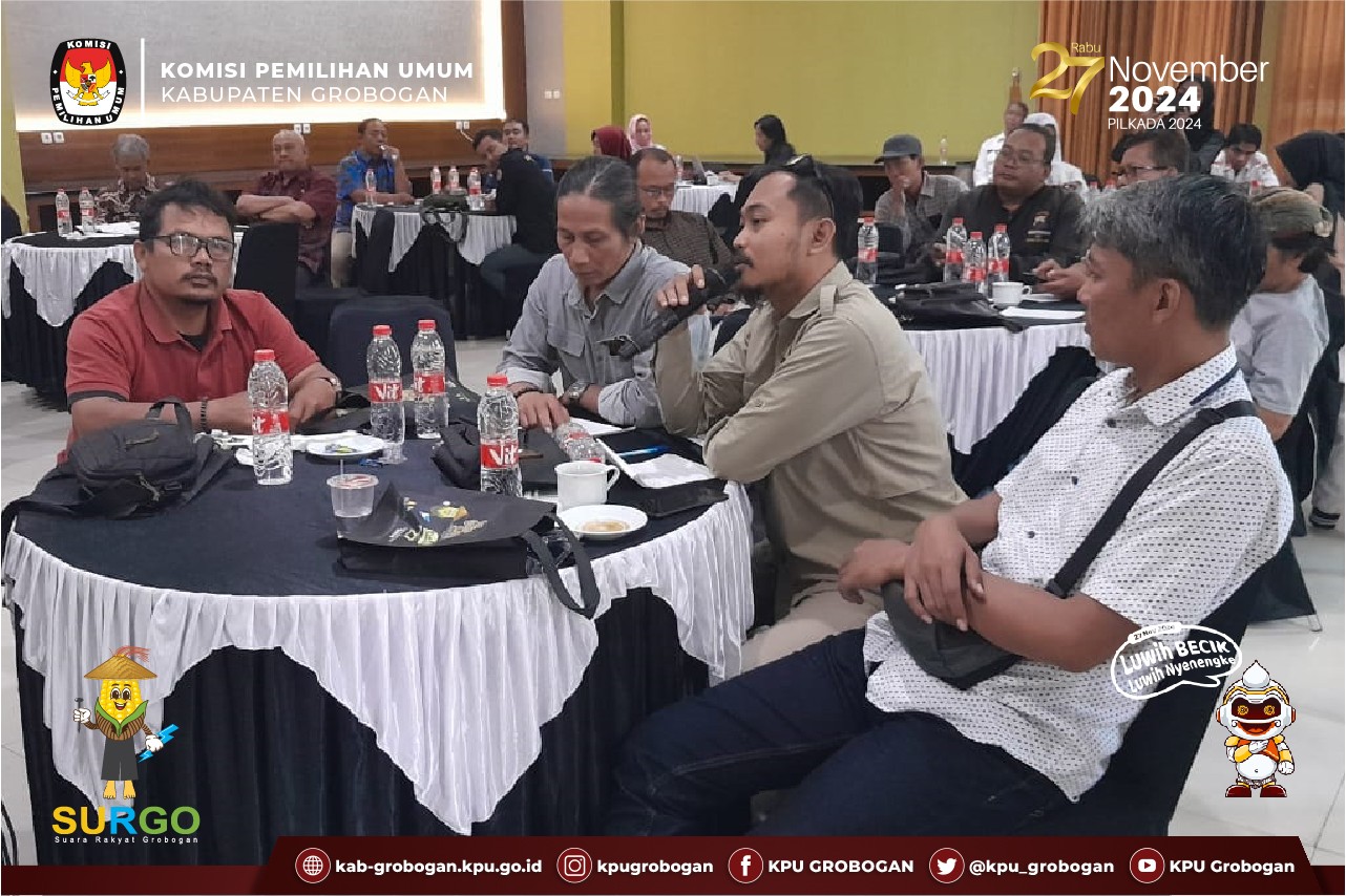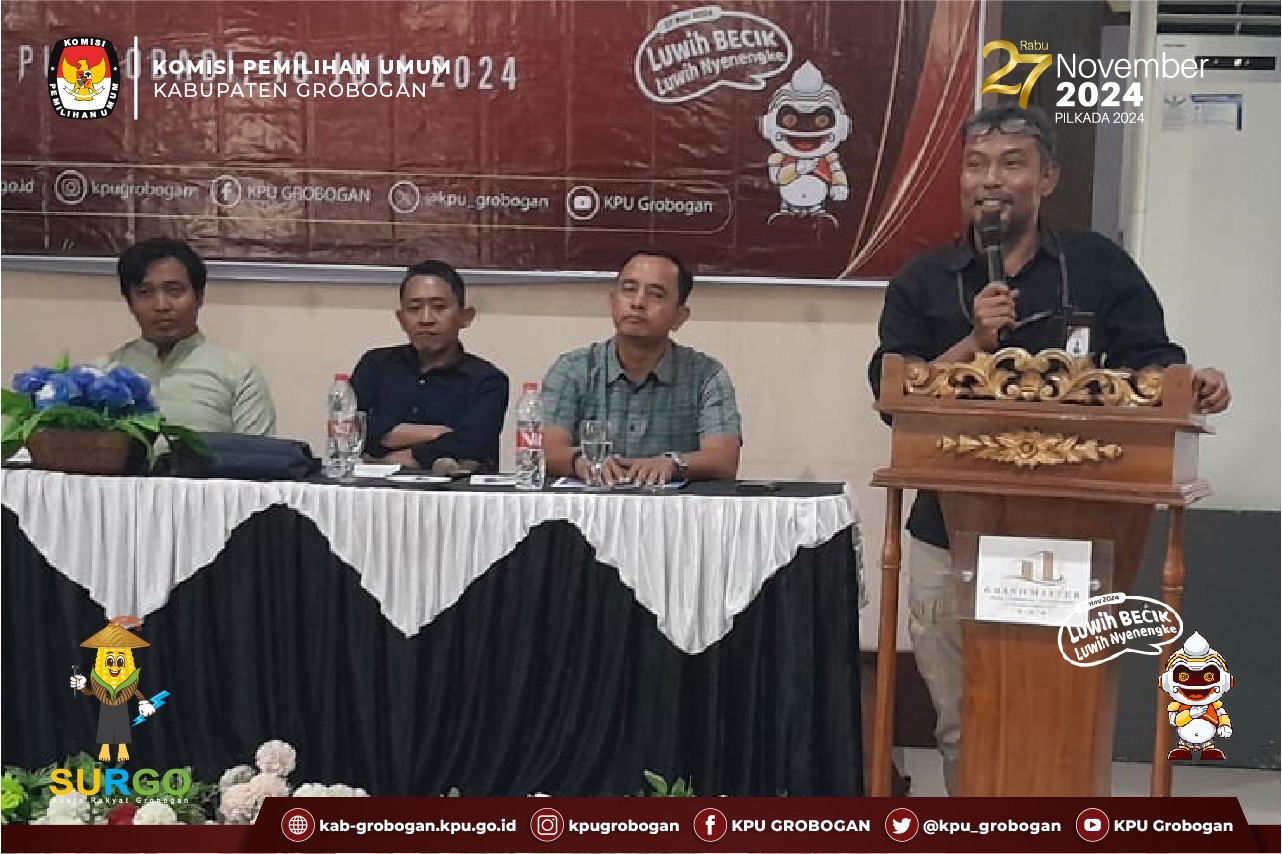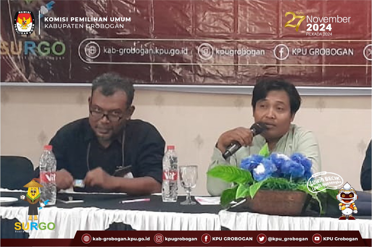 Bertindak sebagai moderator sekaligus narasumber dalam acara ini Bapak Ngatiman, S.E. Anggota KPU Kabupaten Grobogan Divisi Sosdiklih Parmas dan SDM serta dihadiri juga oleh narasumber lain yaitu dari Polres Grobogan yang diwakili oleh Bapak AKP Joko Susilo dan Pengurus IJTI Kabupaten Grobogan yang diwakili oleh Bapak Rubadi.