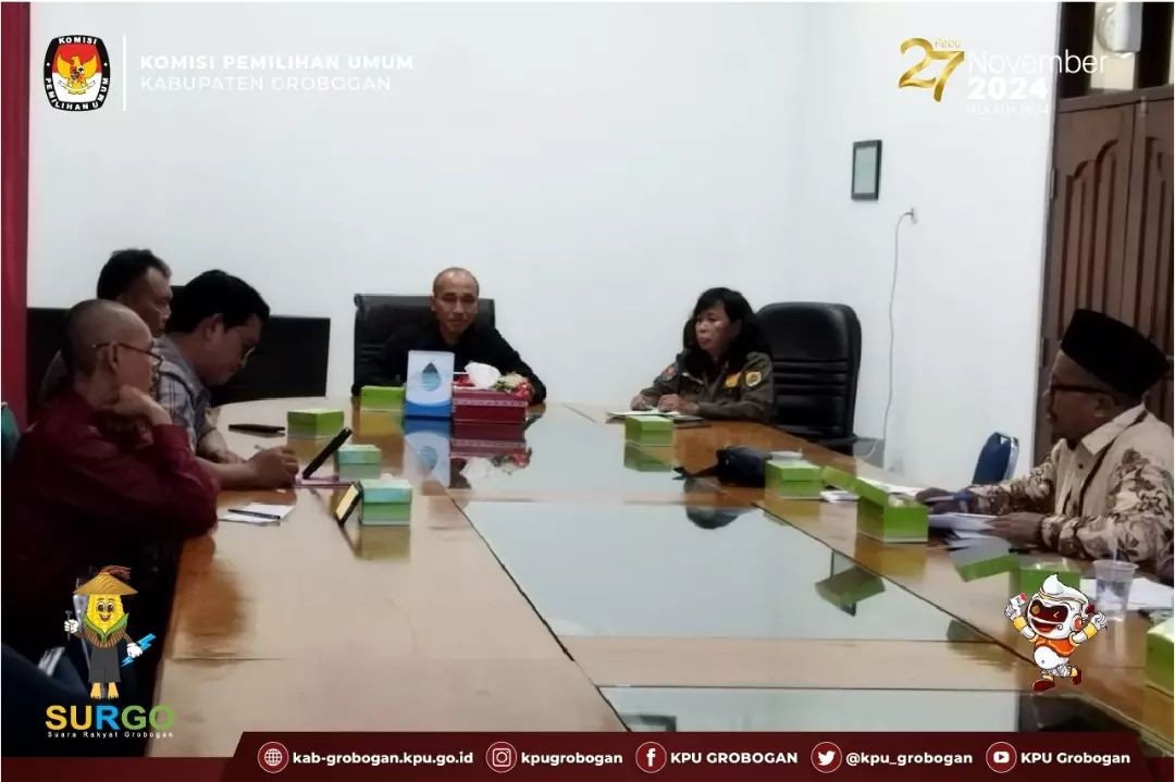 PURWODADI - Dalam rangka koordinasi serta penyamaan persepsi terhadap beberapa hal tentang Alat Peraga Kampanye (APK) dalam pelaksanaan Pilkada Serentak Tahun 2024 di Kabupaten Grobogan, pada hari Selasa tanggal 2 JUli 2024, bertempat di Ruang Rapat Sekda Grobogan, KPU Kabupaten Grobogan yang diwakili oleh Bapak Muh Syaifudin, S.Pd.I, M.Pd. Anggota KPU Kabupaten Grobogan Divisi Hukum dan Pengawasan hadir dalam Rapat Forum Fasilitasi Penegakan Perda tentang Koordinasi Pembahasan Pemilihan Kepala Daerah 2024 yang diselenggarakan oleh Sekretariat Daerah Grobogan.