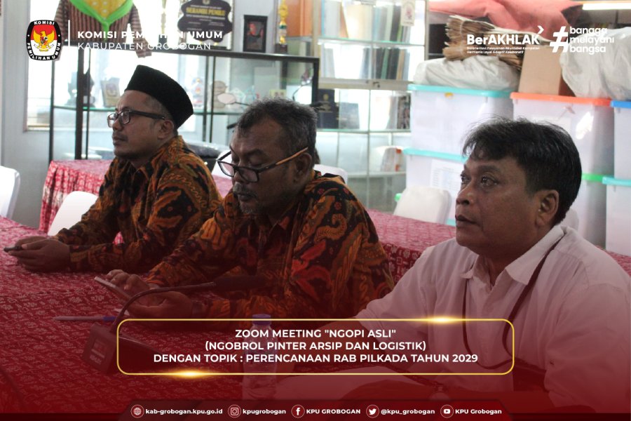 Hai #TemanPemilih, KPU Kabupaten Grobogan mengikuti Zoom Meeting "NGOPI ASLI" (Ngobrol Pinter Arsip dan Logistik) bertempat di Aula Kantor KPU Kabupaten Grobogan yang diselenggarakan oleh KPU Provinsi Jawa Tengah, Senin (2/6/2025).