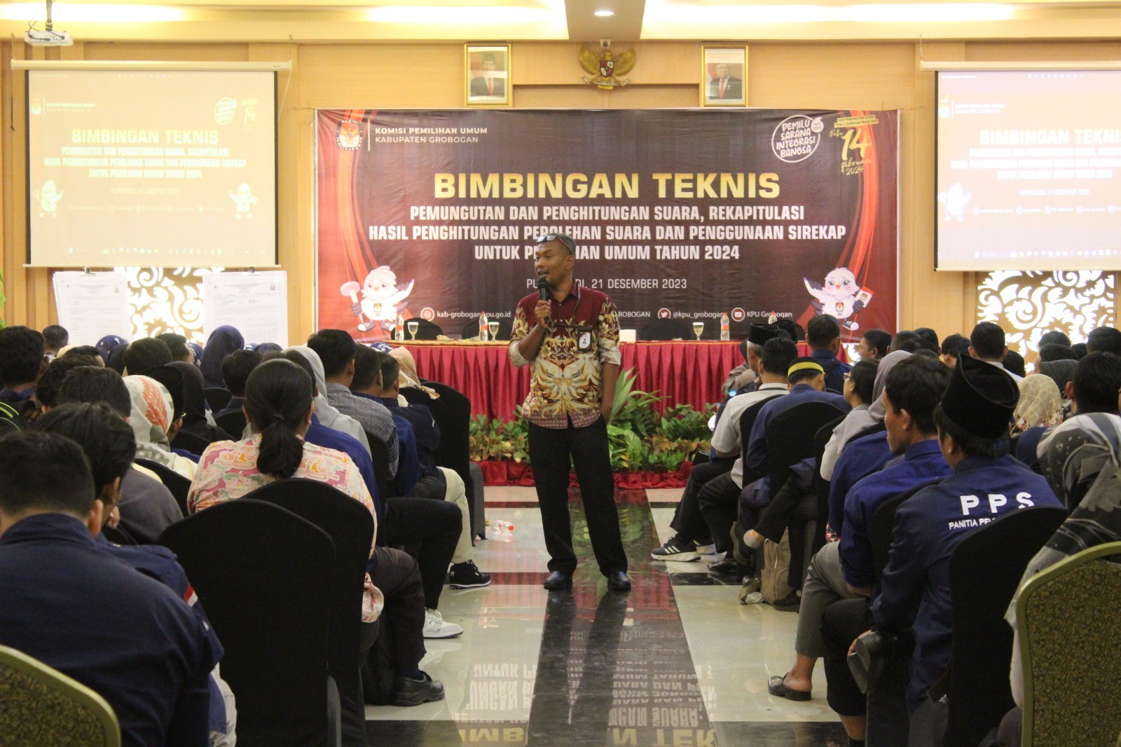 PURWODADI - Kamis (21/12/2023) KPU Kabupaten Grobogan mengadakan Bimbingan Teknis Pemungutan dan Penghitungan Suara, Rekapitulasi Hasil Penghitungan Perolehan Suara dan Penggunaan Sirekap Untuk Pemilihan Umum Tahun 2024. Kegiatan yang bertempat di Hotel 21 Purwodadi ini diikuti oleh Ketua PPK beserta Anggota PPK Koordinator Teknis Pungut Hitung dan Anggota PPS Koordinator Data dan Pungut Hitung.
