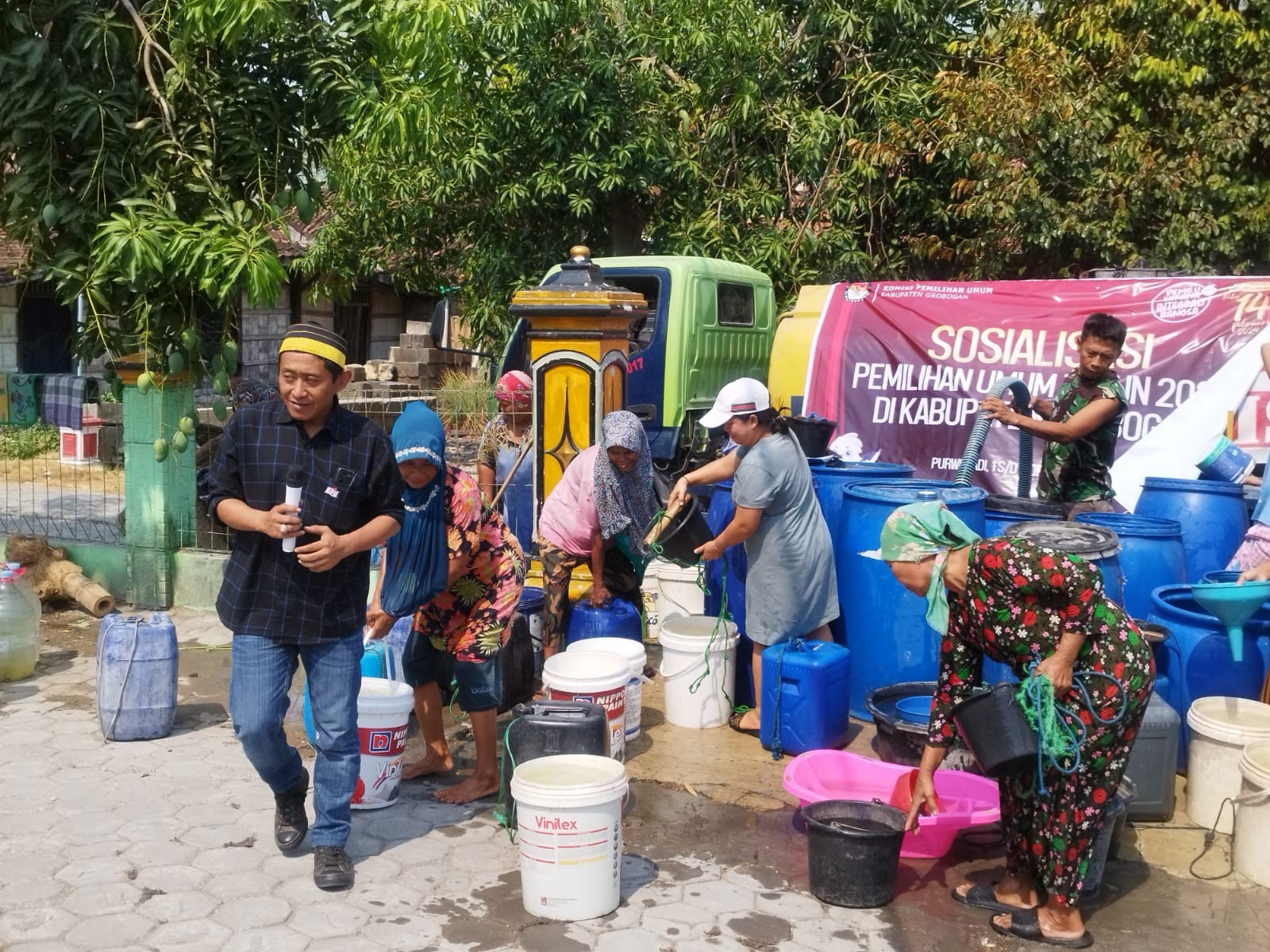 PURWODADI - Memasuki hari ke-2 pelaksanaan Kirab Pemilu Tahun 2024 di Kabupaten Grobogan, hari ini KPU Kabupaten Grobogan melakukan Sosialisasi dan Bantuan Sosial dalam Bentuk Pemberian Air Bersih kepada Masyarakat Terdampak Kekeringan. Adapun lokus dari kegiatan ini yaitu berada di Pasar Induk Purwodadi yang merupakan salah satu pusat keramaian dan Desa Nambuhan Dusun Cengklik yang merupakan salah satu wilayah terdampak kekeringan.