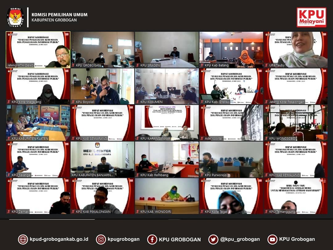 Rapat Koordinasi Evaluasi Kehumasan dan Pengelolaan Informasi Publik diagendakan oleh KPU Provinsi Jawa Tengah hari ini. KPU Kabupaten Grobogan dan 34 KPU Kabupaten/Kota lainnya ikut hadir menjadi undangan pada acara tersebut. Berkenan memberikan sambutan adalah Ketua KPU Provinsi Jawa Tengah Bapak Yulianto Sudrajat MI, Kom, dan Ibu Diana Ariyanti, SP (Anggota KPU Provinsi Jawa Tengah) sebagai narasumber.