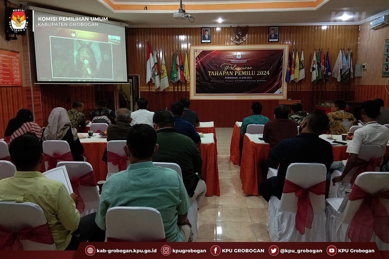 PURWODADI - Malam ini tepatnya hari Rabu tanggal 14 Juni 2022 pukul 19.00 WIB seluruh jajaran KPU Republik Indonesia menyelenggarakan kegiatan Nonton Bareng Peluncuran Tahapan Pemilu 2024 secara serentak. KPU Kabupaten Grobogan melaksanakan kegiatan tersebut bertempat di Aula Kantor KPU Kabupaten Grobogan Jl. Letjen S. Parman No. 2 Purwodadi. Tamu undangan pada kegiatan kali ini antara lain Bupati Grobogan, Kapolres Grobogan, Dandim 0717 Grobogan, Kepala Kejaksaan Negeri Grobogan, Ketua Bawaslu Grobogan, Kepala Badan Kesbangpol Kabupaten Grobogan dan Kepala Kantor Kemenag Grobogan serta Partai Politik peserta pemilu.
