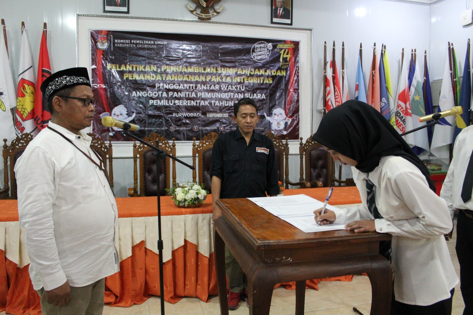 PURWODADI - Hari ini Rabu, 6 September 2023 pukul 13.00 WIB, bertempat di Aula KPU Kabupaten Grobogan Jl. Letjen. S. Parman No. 2 Purwodadi, KPU Kabupaten Grobogan melaksanakan Pelantikan sekaligus pengambilan sumpah/janji serta penandatanganan pakta integritas Pengganti Antar Waktu Anggota Panitia Pemungutan Suara (PPS) Desa Pahesan dan Desa Sumberagung Kecamatan Godong.