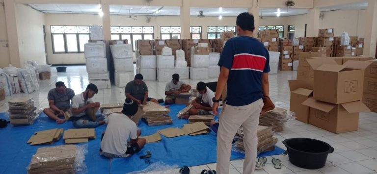 Para pekerja di gedung Wisuda Budaya tengah menata kardus yang akan dipergunakan sebagai wadah logistik yang siap didistribusikan ke tingkat PPK.