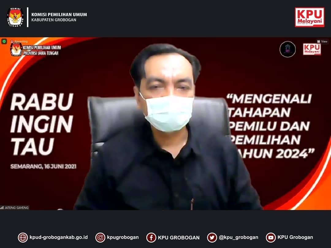 Menjelang pelaksanaan tahapan Pemilu Serentak Tahun 2024 yang akan dimulai di awal tahun 2022, salah satu hal yang perlu dipersiapkan adalah sumber daya manusia yang ber-integritas, oleh karena itu pada forum diskusi Rabu Ingin Tahu pada Rabu, 16 Juni yang diselenggarakan secara daring oleh KPU Provinsi Jawa Tengah mengambil topik “ Mengenali Tahapan Pemilu dan Pemilihan 2024” .