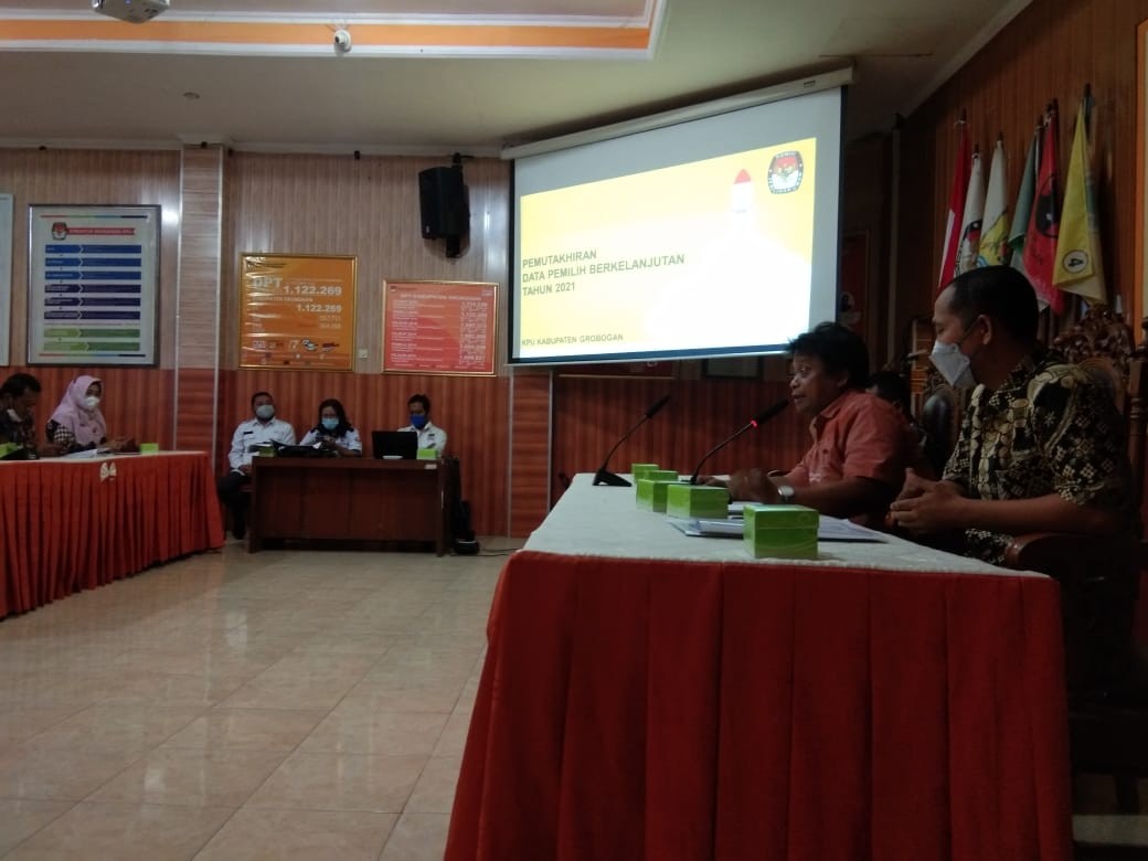 Hari ini, KPU Kabupaten Grobogan mengadakan rapat Koordinasi Pemutakhiran Data Pemilih Berkelanjutan Tahun 2021 Perode Bulan Desember Tahun 2021. Hadir sebagai tamu undangan kali ini adalah Polres Grobogan Kodim 0717 Purwodadi, Disdukcapil Kabupaten Grobogan, Dinas Kesbangpol Kabupaten Grobogan, Kantor Kemenag Kabupaten Grobogan Bawaslu, Dinas Pendidikan Provinsi Jawa Tengah Cabang IV, Kemenag Kabupaten GRobogan, Lapas IIB Purwodadi dan jajaran Partai Politik di Kabupaten Grobogan.