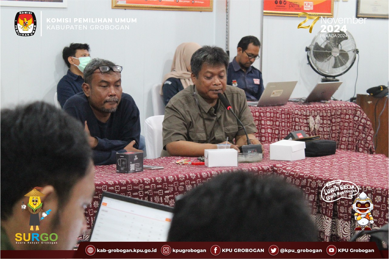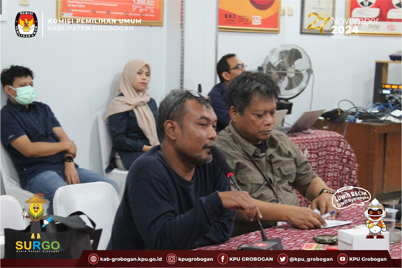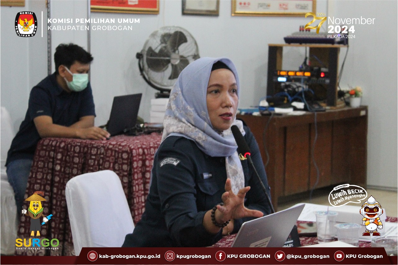 Selanjutnya arahan oleh Anggota KPU Kabupaten Grobogan Divisi Perencanaan, Data dan Informasi Bapak Agung Budi Prasetyo, A.Md. Beliau menyampaikan bahwa telah dilakukan komunikasi dengan pemangku kepentingan di tiap tingkatan dalam penyusunan daftar pemilih. Dalam press release Bawaslu RI terkait pengawasan pemutakhiran data pemilih, secara umum untuk Provinsi Jawa Tengah tidak ada masalah, ungkap Beliau. Beliau berharap data yang nantinya dihasilkan benar-benar valid dan dapat dipertanggungjawabkan. Disampaikan bahwa terkait agenda hari ini adalah fokus penyelesaian unggah data pemilih TMS, unggah data pemilih ubah, unggah data pemilih baru, penyelesaian terhadap pemilih ganda dan bukti dukungnya, unggah data pemilih loksus dan identifikasi dari hasil pemetaan kemarin bila ada NKK yang terpisah, karena secara aturan tidak boleh memisahkan pemilih dalam satu KK.