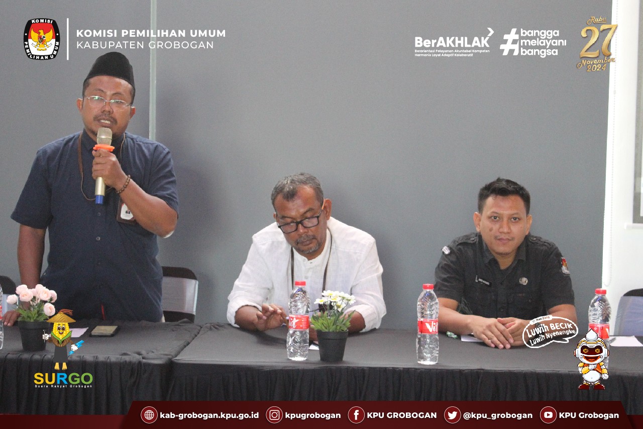 Rapat diawali sambutan dari Ketua KPU Kabupaten Grobogan yang diwakili oleh Bapak Muh Syaifudin, S.Pd.I, M.Pd, Anggota KPU Kabupaten Grobogan Divisi Hukum dan Pengawasan, yang sekaligus membuka acara. Disampaikan terima kasih dan apresiasi setinggi tingginya kepada jajaran PPK beserta Sekretariat yang telah mensukseskan Pilkada Serentak Tahun 2024, termasuk pelaksanaan Rapat Pleno Terbuka Rekapitulasi Tingkat Provinsi kemarin yang telah berjalan sukses, dimana KPU Kabupaten Grobogan berada di urutan kedua setelah Kota Salatiga, tentunya ini tak lepas dari ikhtiar serta doa dari rekan-rekan sekalian, tambah Beliau .