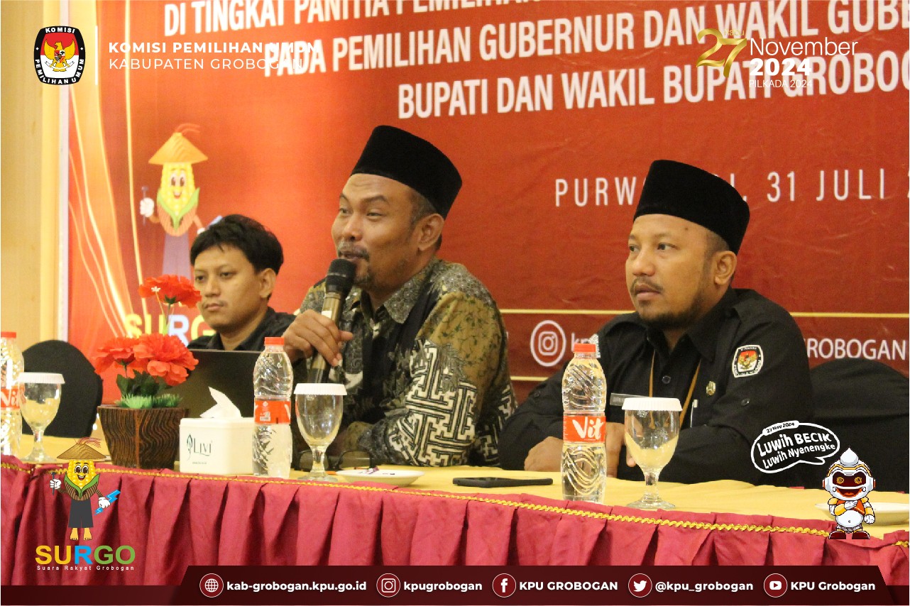Hai #temanpemilih , KPU Kabupaten Grobogan menyelenggarakan Rapat Koordinasi Persiapan Penyusunan dan Rekapitulasi Daftar Pemilih Hasil Pemutakhiran di Tingkat Panitia Pemilihan Kecamatan (PPK) dan Panitia Pemungutan Suara (PPS) pada Pemilihan Gubernur dan Wakil Gubernur Jawa Tengah serta Bupati dan Wakil Bupati Grobogan Tahun 2024, Rabu (31/7/2024).