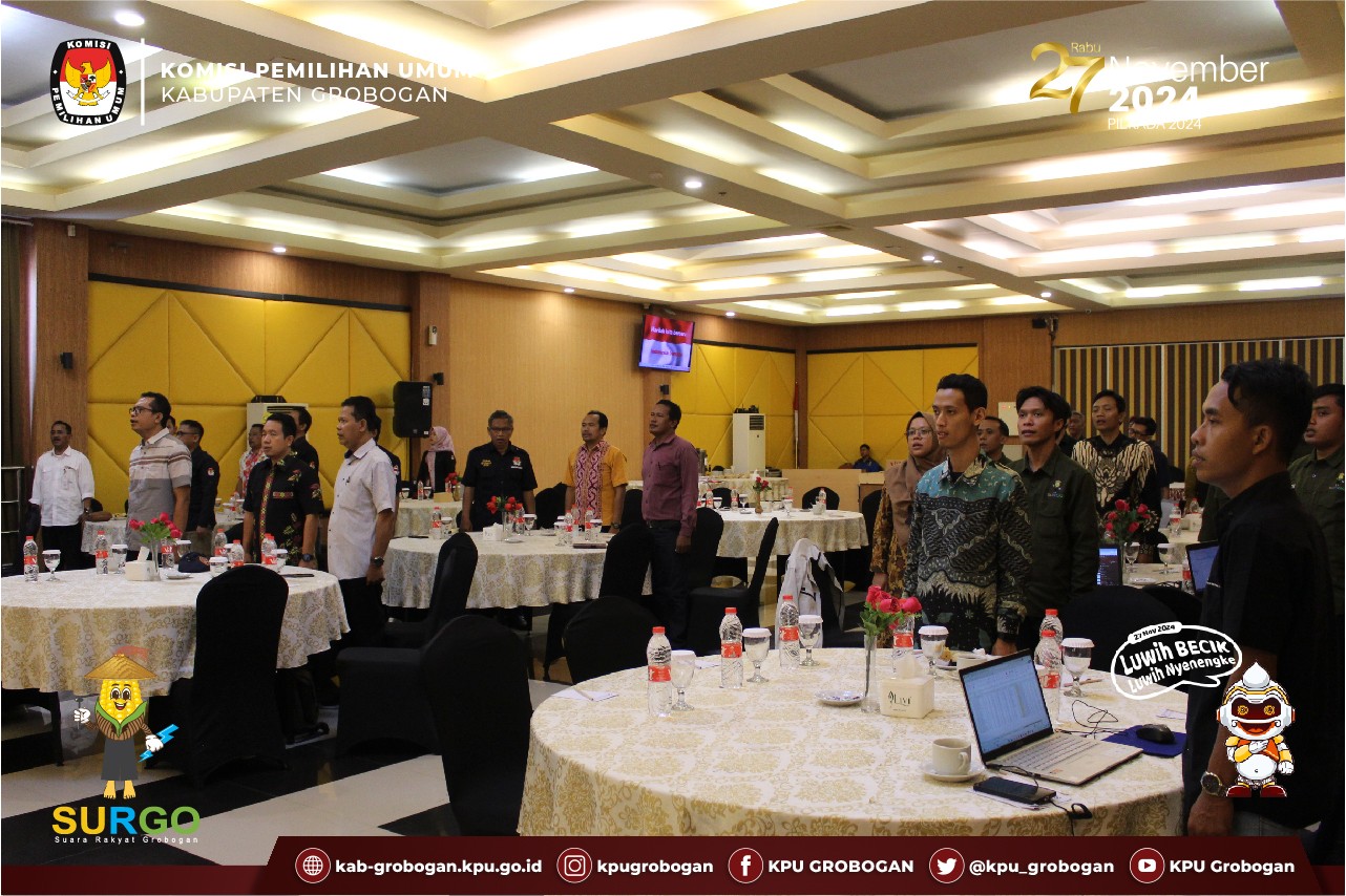 Acara dibuka oleh Ketua KPU Kabupaten Grobogan yang diwakili oleh Bapak Agung Budi Prasetyo, A.Md. Anggota KPU Kabupaten Grobogan Divisi Perencanaan, Data dan Informasi yang sekaligus menjadi narasumber dalam rapat koordinasi ini.