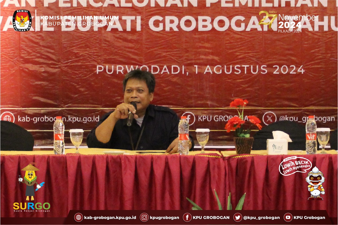 Acara dibuka oleh Ketua KPU Kabupaten Grobogan Bapak Agung Sutopo, S.Pi. Dalam sambutannya beliau menyampaikan bahwa rapat koordinasi ini sangatlah penting mengingat terdapat keterlibatan beberapa instansi dalam pencalonan dalam hal pemenuhan persyaratan, terkait dokumen-dokumen yang harus dipersiapkan oleh bakal pasangan calon menjelang pendaftaran di tanggal 27 s.d. 29 Agustus 2024. Beliau berharap terjalinnya komunikasi yang lebih intens antara Partai Politik dengan KPU Kabupaten Grobogan dan juga pengawalan dari Bawaslu Kabupaten Grobogan guna suksesi penyelenggaraan Pilkada Tahun 2024.
