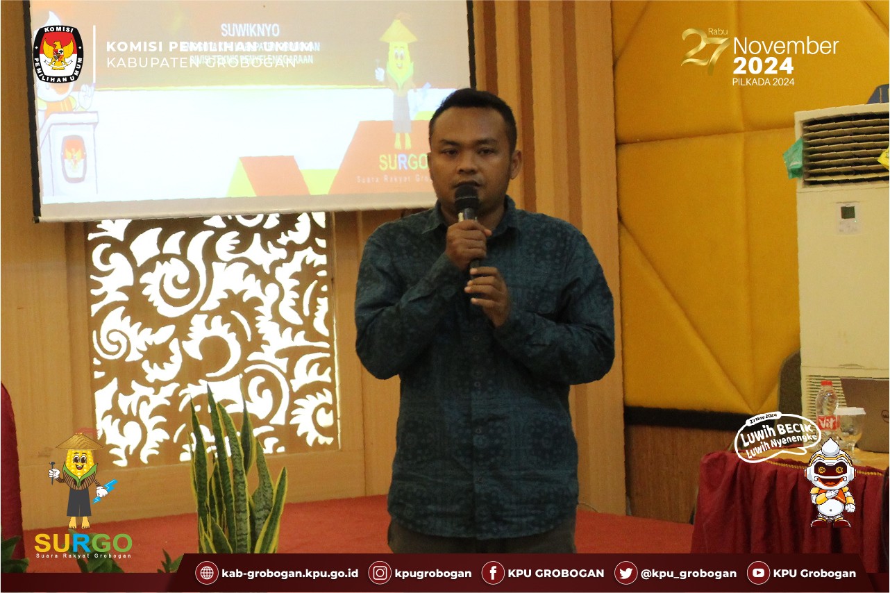 Selanjutnya pemaparan materi oleh Anggota KPU Kabupaten Grobogan Divisi Teknis Penyelenggaraan Bapak Suwiknyo, S.Pd.I. selaku leading sector dalam kegiatan ini. Beliau menyampaikan materi mengenai Tahapan Pencalonan dalam Pemilihan Bupati dan Wakil Bupati Grobogan Tahun 2024 yang meliputi program dan jadwal kegiatan termasuk mekanisme serta syarat-syarat yang harus dipenuhi dalam pencalonan. Beliau berharap kepada Partai Politik, kedepan untuk berkomunikasi dengan KPU Kabupaten Grobogan melalui helpdesk berkaitan dengan syarat sah calon dan syarat pencalonan.