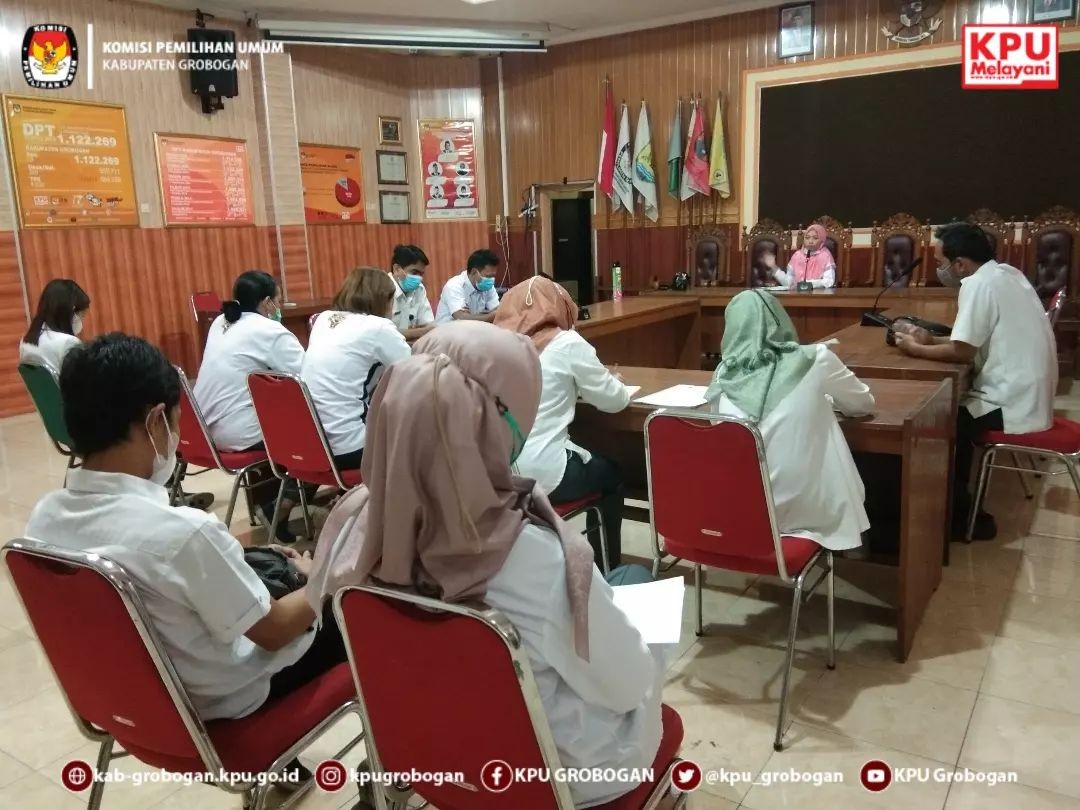 Dimulai Pukul 08.30 WIB, Sekretaris KPU Kabupaten GroboganYudhaviska AS, S, MH memimpin jalannya rapat rutin sekretariat. Rapat rutin ini dilaksanakan setiap hari Senin, dengan agenda penyampaian dan evaluasi kegiatan seminggu yang lalu serta pemaapran rencana kegiatan di minggu yang akan datang.