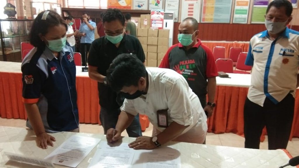 Ketua KPU Grobogan, Agung Sutopo, menandatangani berita acara penyerahan bahan kampanye yang akan diserahkan kepada paslon melalui perwakilan tim kampanye.