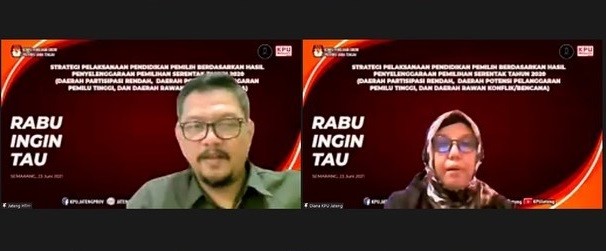 Untuk mensukseskan pelaksanaan kegiatan Fasilitasi Pendidikan Pemilih tahun 2021 bagi 21 KPU Kabupaten/ Kota di Jawa Tengah, maka KPU Provinsi Jawa Tengah mengajak berdiskusi bersama seluruh Divisi Sosialisasi, Pendidikan Pemilih dan Parmas KPU Kabupaten/ Kota se Jawa Tengah dalam forum mingguan Rabu Ingin Tahu (RIT) , pada hari Rabu , 23 Juni 2021 yang dilaksanakan secara daring dengan topik “ Strategi Pelaksanaan Pendidikan Pemilih Berdasarkan Hasil Penyelenggaraan Pemilihan Serentak Tahun 2020”.